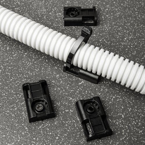 Площадка под стяжку используется для фиксации кабелей, а также жестких и гофрированных труб к поверхности. Предназначена для прямого монтажа. Выполнена из черного пластика. Установка площадки производится с помощью монтажного пистолета, также возможен монтаж с помощью дюбелей и саморезов. Специальный выступ возле отверстия для крепежа демпфирует удар при забивании площадки пистолетом, что гарантирует повышенную устойчивость к разлому. При креплении к дереву соблюдайте осторожность – отрегулируйте силу удара пистолета. Рекомендуемый диаметр ствола – 11 мм.