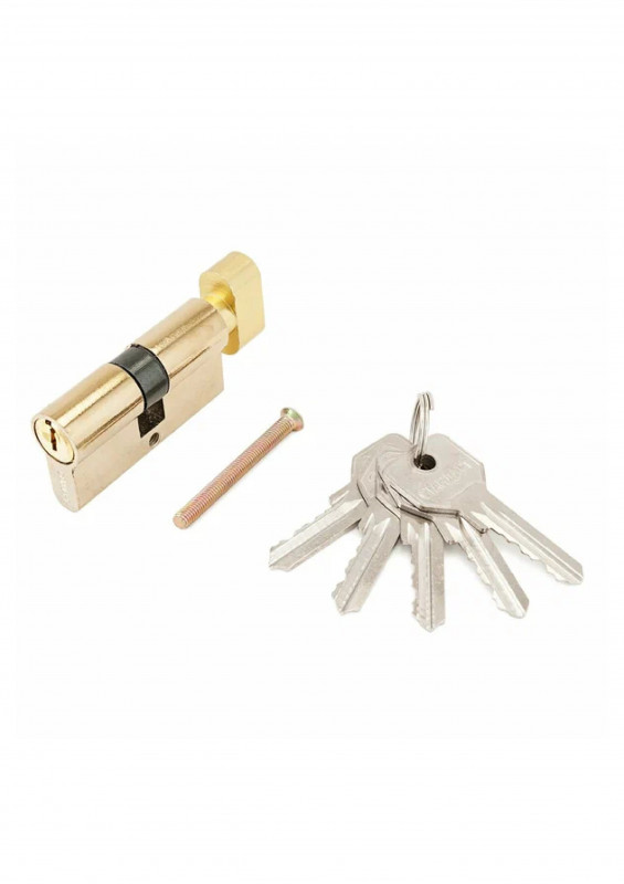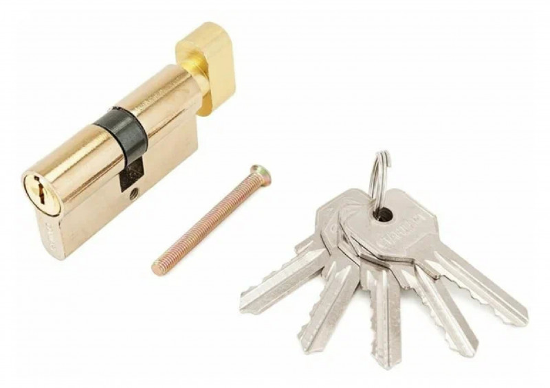 Цилиндровый механизм Стандарт устанавливается вместе с врезным замком. Запирание осуществляется с помощью английского ключа, который идет в комплекте в количестве 5 штук. Кулачок механизма выдвинут на 30 градусов от плоскости, что препятствует выбиванию цилиндра из двери.