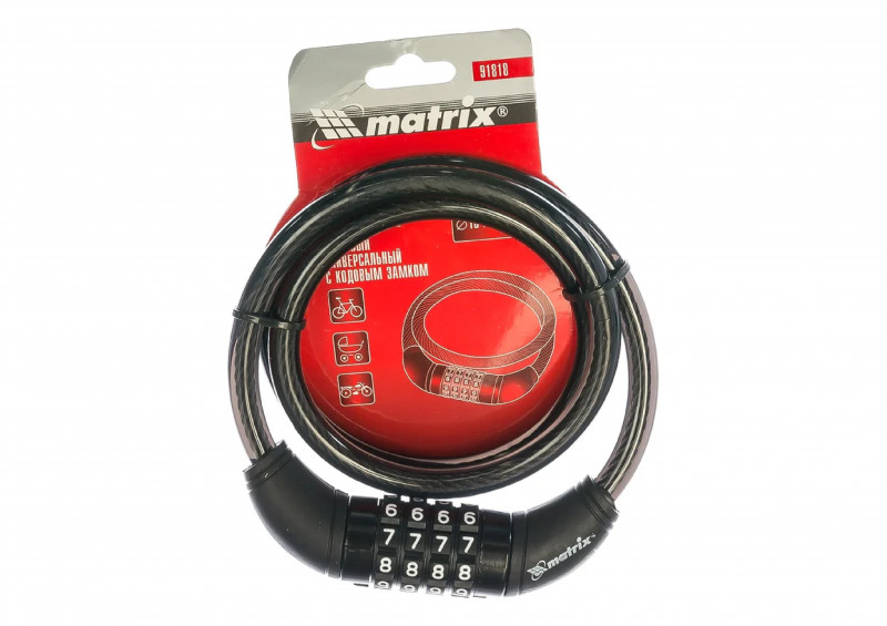 Замок тросовый универсальный с кодовым механизмом MATRIX предназначен для обеспечения сохранности велосипедов, детских колясок, санок, мототехники и т.д., а так же для запирания хозяйственных помещений.